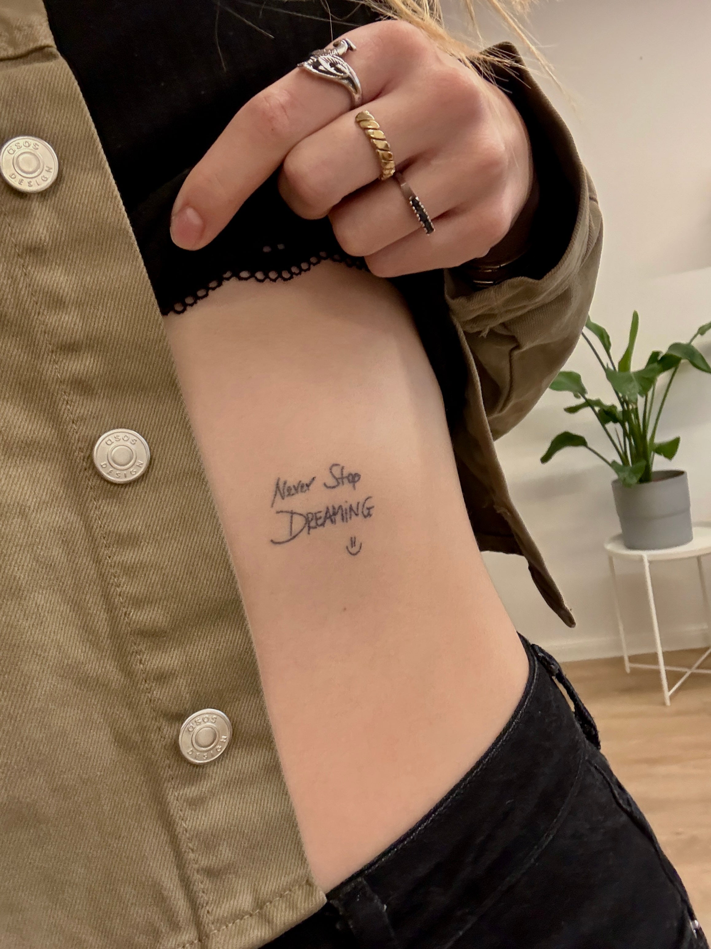 Tu trouveras toutes les informations sur ce qui est possible et sur les exigences auxquelles ton dessin doit répondre dans le « Guide rapide du tatouage personnalisé » sur la page produit de la taille de tatouage que tu as choisie.