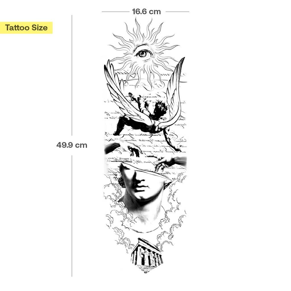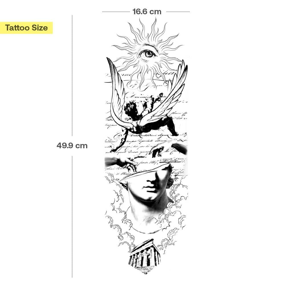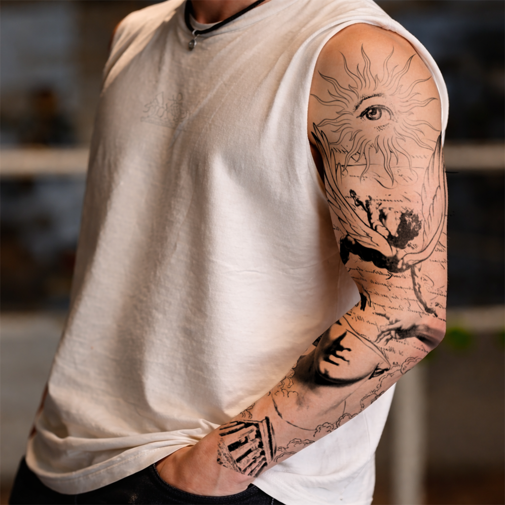 Nos nouveaux tatouages en manchette ne sont pas seulement les plus grands et les plus détaillés au monde, ils ont également été développés en collaboration avec un véritable tatoueur : parfaitement adaptés au bras, avec des motifs forts et symboliques – comme de véritables tatouages en manchette.