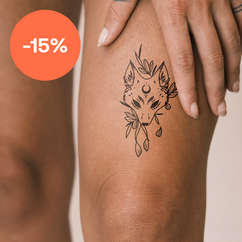 Le Renard Fleuri - Un tatouage temporaire plein de sens et d'inspiration! Le Renard Fleuri est bien plus qu'un simple tatouage - c'est un symbole de liberté, de force et de croissance personnelle. L'histoire derrière ce motif est profonde et fascinante. Le renard représente traditionnellement la sagesse et la ruse, tandis que les fleurs symbolisent la beauté et le changement. Ensemble, ils représentent le désir de croissance intérieure et la capacité de s'adapter et de s'épanouir dans toutes les situations. Que vous traversiez un changement personnel ou que vous souhaitiez simplement souligner votre force intérieure, le Renard Fleuri est le tatouage parfait pour vous rappeler que vous êtes capable de relever tous les défis. Le tatouage du Renard Fleuri convient parfaitement à différentes parties du corps. Pour des surfaces plus grandes comme la poitrine ou le dos, le design peut se déployer pleinement et attirer tous les regards. Si vous préférez quelque chose de plus discret, la zone derrière l'oreille ou les côtes sont idéales. Peu importe où vous choisissez de le placer, le Renard Fleuri attirera certainement l'attention. Avec le tatouage du Renard Fleuri, vous pouvez compléter votre style personnel de manière unique. Associez-le à une tenue décontractée pour un look streetstyle parfait ou optez pour une robe élégante pour une occasion spéciale. Ce tatouage convient à toutes les occasions et apporte une touche individuelle à votre look. Le tatouage du Renard Fleuri convient à tous ceux qui souhaitent exprimer leur personnalité et leur style de manière non conventionnelle. Il est parfait pour les jeunes qui préfèrent éviter les tatouages permanents ou qui veulent simplement essayer un tatouage. Que vous assistiez à un festival, une fête d'anniversaire ou que vous prévoyiez une escapade en ville, le Renard Fleuri est l'accessoire idéal pour compléter votre look. Montrez au monde votre force intérieure et votre individualité avec ce fascinant tatouage temporaire. Découvrez la magie du Renard Fleuri et commandez dès aujourd'hui votre tatouage temporaire d'Inkster. Avec une durabilité pouvant aller jusqu'à deux semaines, il vous offre la possibilité de tester votre style et de laisser libre cours à votre créativité. Laissez-vous inspirer par la signification symbolique et la polyvalence de ce tatouage et trouvez votre expression personnelle avec le Renard Fleuri d'Inkster.