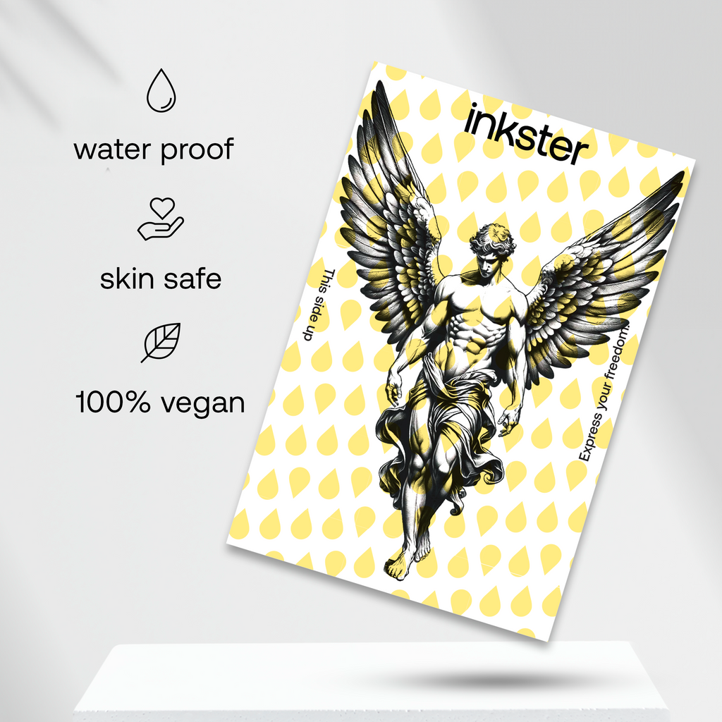 Pour ton tatouage révolutionnaire de 2 semaines d'Inkster, tout ce dont tu as besoin est le tatouage, qui sera livré à ta porte. Les instructions sur la façon d'appliquer le tatouage se trouvent sur l'emballage du tatouage. Ne t'inquiète pas, c'est très simple, rien ne peut mal tourner !