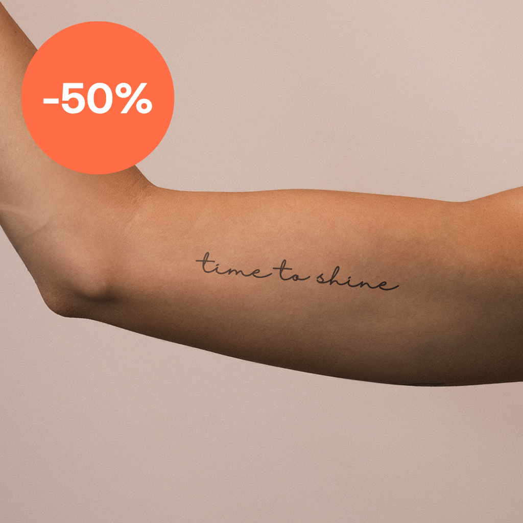 Temps de briller - Le tatouage temporaire qui exprime votre éclat intérieur Inspirations et significations : Le tatouage "Temps de briller" incarne le message inspirant selon lequel il est temps de révéler votre véritable bonheur et votre éclat intérieur. Il symbolise le moment où vous sortez de l'ombre et montrez votre lumière unique au monde. Que vous soyez inspiré(e) par vos racines culturelles, des références historiques ou des histoires personnelles, ce tatouage vous encourage à suivre votre propre chemin et à vivre vos passions avec confiance en vous. Emplacements recommandés : Ce tatouage polyvalent peut être porté sur différentes parties du corps, selon la façon dont vous souhaitez mettre en valeur votre éclat intérieur. Sur des surfaces plus larges comme la poitrine ou le dos, "Temps de briller" est une déclaration impressionnante qui souligne votre personnalité. Si vous préférez quelque chose de plus subtil, vous pouvez également placer ce tatouage sur des zones plus petites et plus délicates, comme derrière l'oreille ou dans la région des côtes. Ainsi, vous pouvez le montrer ou le porter comme un symbole secret de votre force intérieure. Conseils de style : Le tatouage "Temps de briller" est un accessoire polyvalent qui complète parfaitement votre style personnel. Associez-le à une tenue décontractée pour un look détendu mais expressif. Si vous souhaitez vous habiller pour un dîner élégant ou une fête, ce tatouage ajoutera une touche de raffinement à votre tenue. Pour des occasions spéciales comme des anniversaires ou des escapades en ville, il apportera une touche supplémentaire à votre look et attirera des regards admiratifs. Laissez votre créativité vous guider et trouvez votre propre style unique pour faire briller le tatouage "Temps de briller". Pour qui convient ce tatouage : Ce tatouage est destiné à tous ceux qui souhaitent mettre en valeur leur éclat intérieur sans se faire tatouer de manière permanente. Il s'adresse aux jeunes qui apprécient l'individualité et l'expression de soi et qui cherchent à se détacher des normes conventionnelles. Que vous soyez un festivalier célébrant votre liberté et votre joie de vivre, ou une femme d'affaires montrant sa force et sa détermination - le tatouage "Temps de briller" convient parfaitement à vos intérêts et occasions. C'est le choix idéal pour ceux qui veulent essayer un tatouage temporaire pour exprimer leur propre style et faire briller leur personnalité. Avec le tatouage "Temps de briller" d'Inkster, vous ajoutez une touche unique à votre apparence et montrez au monde qui vous êtes vraiment. Choisissez ce tatouage temporaire pour mettre en valeur votre éclat intérieur et vivre votre vie avec confiance en vous. Osez vous démarquer de la masse et saisir votre moment pour briller !