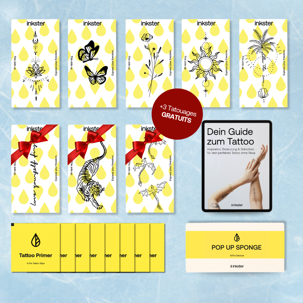 Pour ton tatouage révolutionnaire de 2 semaines d'Inkster, tout ce dont tu as besoin est le tatouage, qui sera livré à ta porte. Les instructions sur la façon d'appliquer le tatouage se trouvent sur l'emballage du tatouage. Ne t'inquiète pas, c'est très simple, rien ne peut mal tourner !