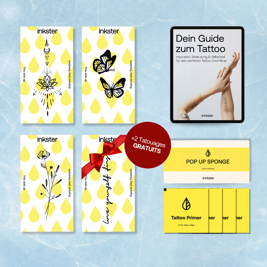 Pour ton tatouage révolutionnaire de 2 semaines d'Inkster, tout ce dont tu as besoin est le tatouage, qui sera livré à ta porte. Les instructions sur la façon d'appliquer le tatouage se trouvent sur l'emballage du tatouage. Ne t'inquiète pas, c'est très simple, rien ne peut mal tourner !